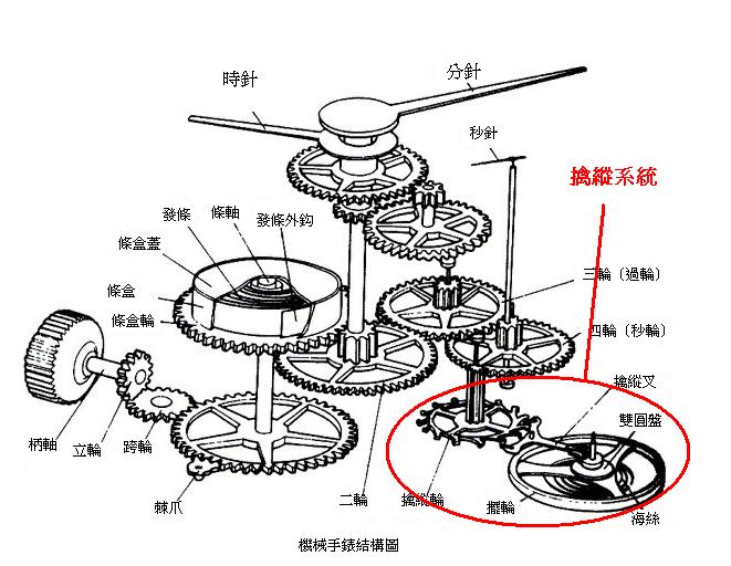 擒縱系統由擒縱機構和 振動系統兩部分組成。振動系統是靠擺輪游絲的週期性振蕩,使擒縱機構保持精確和規律性的持續運動,而取得調速作用的。它包括擺輪部件、游絲部系、快慢針和活動外樁等部件。擒縱機構由擒縱輪、擒縱叉、雙圓盤等部件組成,向振動系統傳遞能量,計量振蕩次數。